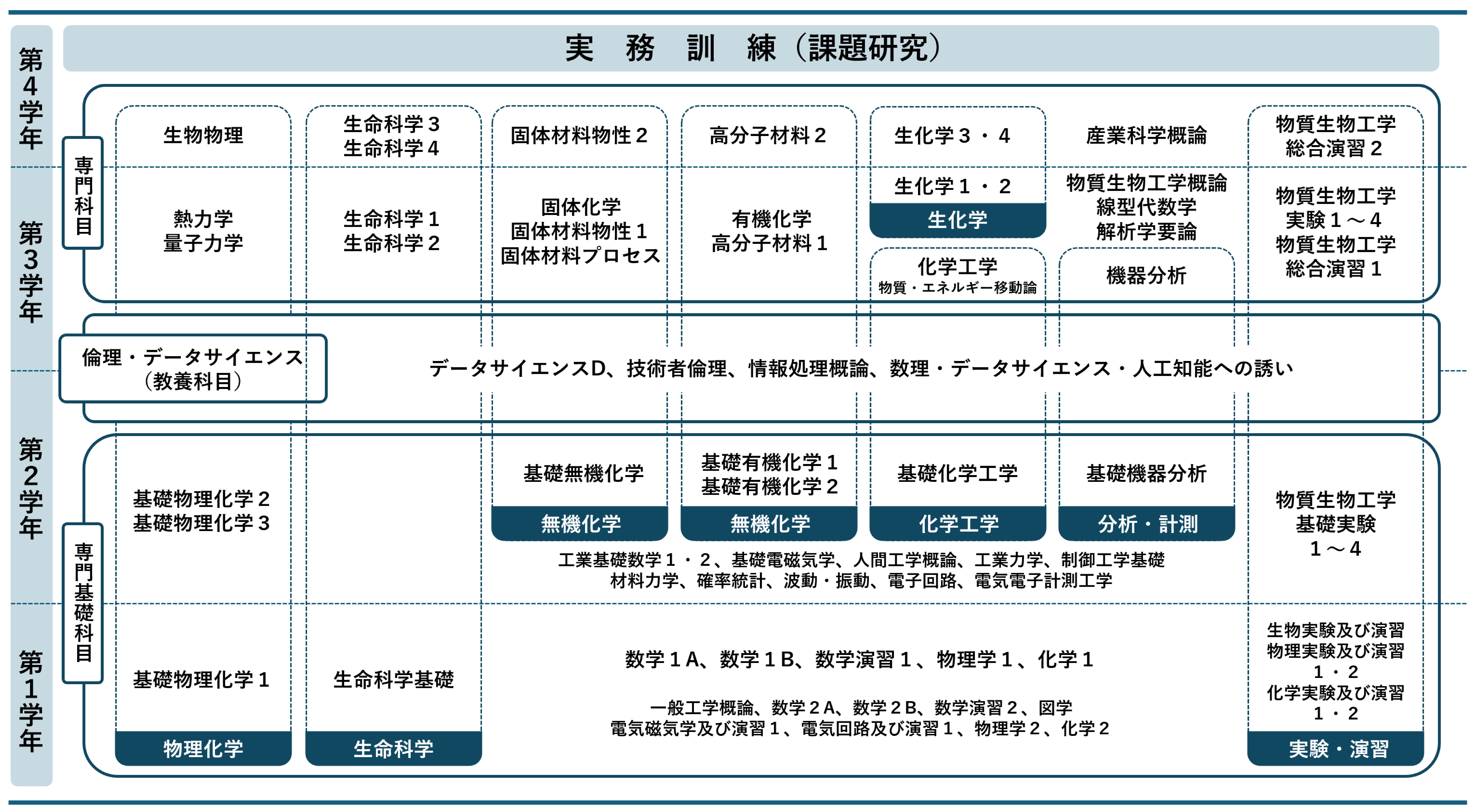 第1学年では数学、物理、化学、生物、情報などの工学の基礎を、第1学年の後半から第2学年では段階的に物質生物工学分野に必須の専門基礎科目を学習します。その中には、物質生物工学分野で必要とされる物理、化学および生物の実験手法の基礎を学ぶ科目が含まれています。第3学年からはより高度な専門科目(物理化学・生物物理学、有機・高分子化学、無機化学、生命科学、生化学)を学習し、第3学年の後半から当分野の広範囲にわたる専門科目について選択学習します。また、データサイエンス科目と連携して、学生実験や研究室での演習では、物質生物工学分野のデータの取り扱いについて理解を深めます。
