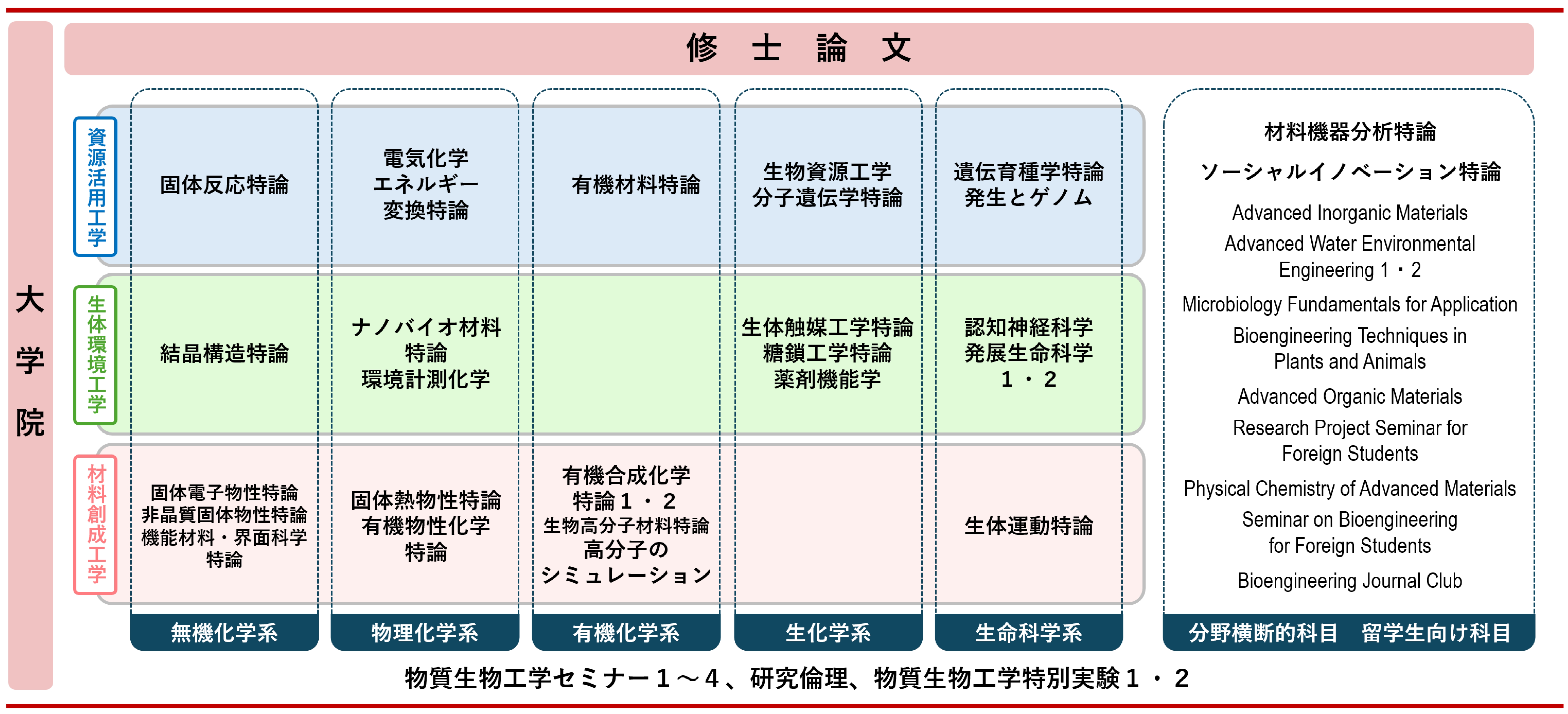 - スクーリングによるケーススタディを通じて、物質生物工学に関わる基礎知識や既存技術を修得し、新材料や新プロセス、バイオテクノロジーへの高いイノベーション意識を有する。
