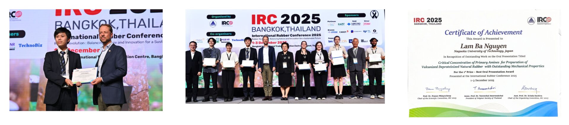 技術科学イノベーション系・GD3 NGUYEN BA LAMさん(河原成元 教授、山野将輝 助教 研究室在籍)が、令和7年12月3日にタイ・バンコクで開催されたInternational Rubber Conference 2025において最優秀口頭発表賞を受賞しました。International Rubber Conferenceは、ゴム科学およびゴム技術分野における国際的に最も権威ある学術会議であり、毎年開催され、世界各国が持ち回りで主催しています。2025年は、12月1日から12月3日にかけて開催されました。